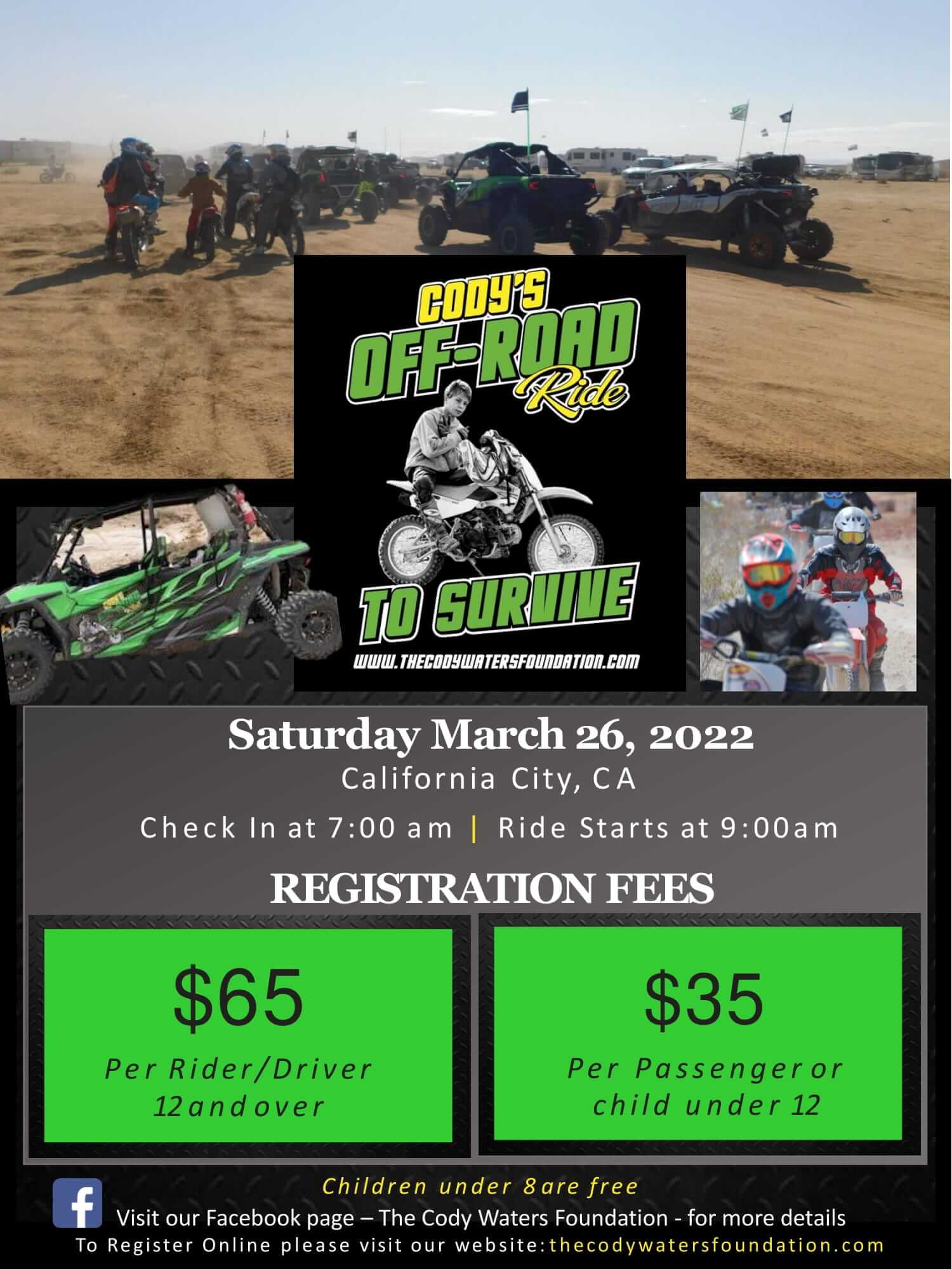 We are honored to once again be supporting the Cody Waters Foundation’s annual Off-Road Ride to Survive. This is one of our favorite events of the year as we meet out in the California desert for a poker run style event, all to help raise money to help children fight cancer. We will be setup as a vendor/sponsor and some of our staff will be participating in the ride. We promote this event to our customers and other riders in our community as well.