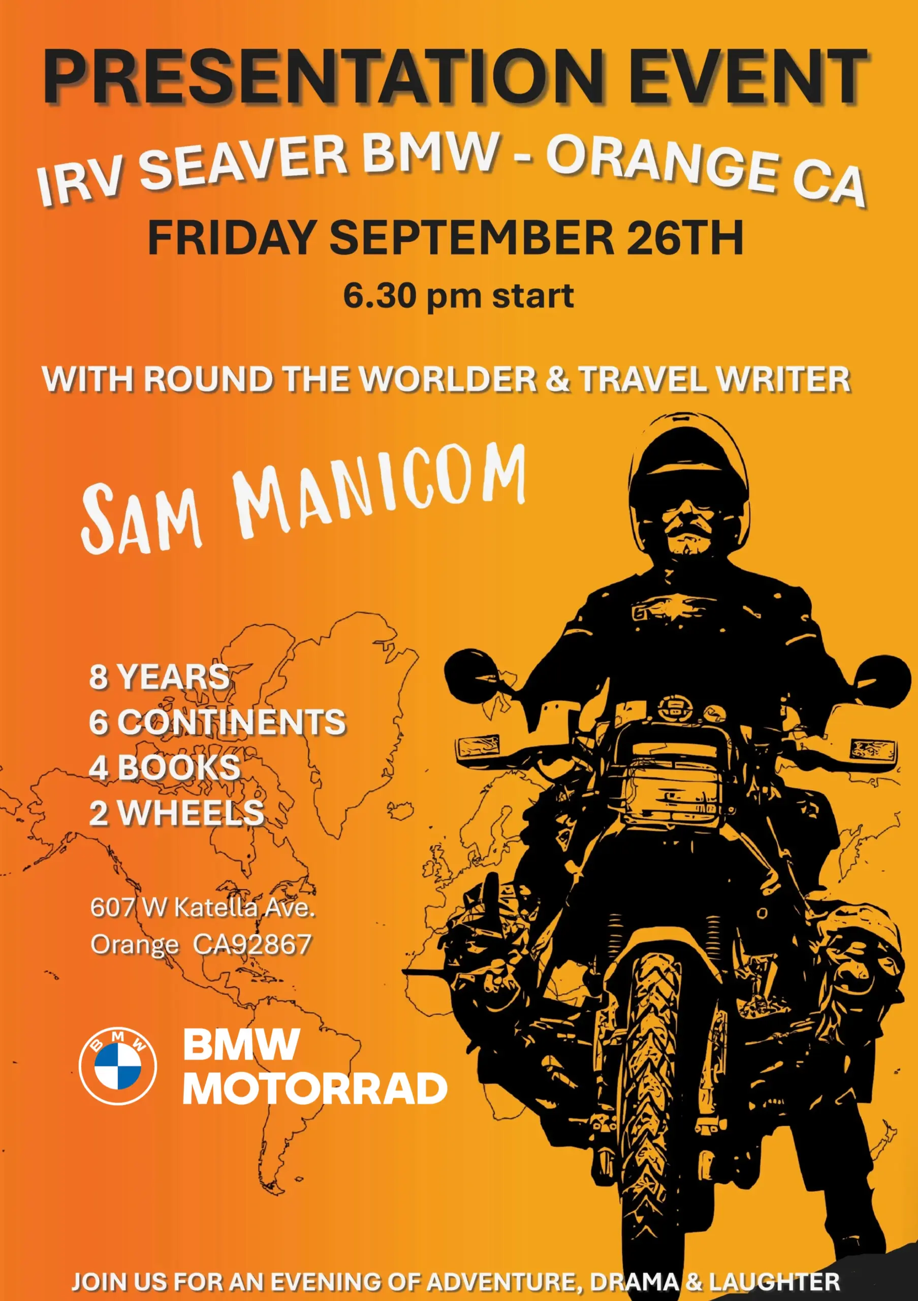 Join Irv Seaver BMW Motorcycles for an epic night of adventure with world traveler and author Sam Manicom on Friday September 26 at 6 pm, show starts at 6:30pm.