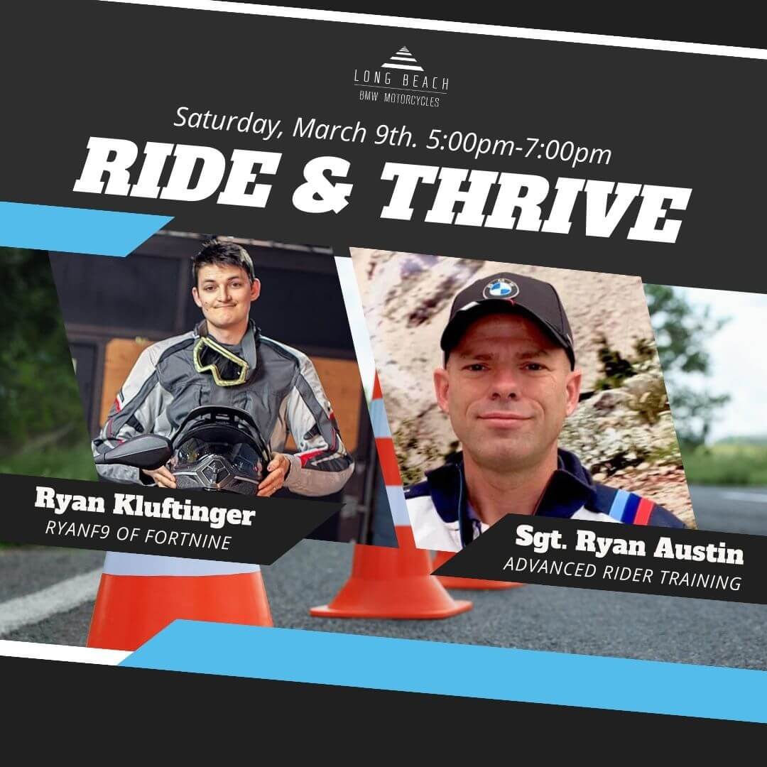 Take your riding safety to the next level with our Ride & Thrive event on Saturday, March 9th! We are welcoming our friend Sgt. Ryan Austin of Advanced Rider Training and Ryan Kluftinger (RyanF9) of FortNine for a pair of presentations on safe riding and safe gear. Plus, Sgt. Austin will be performing some riding demonstrations in the parking lot. See the session details below and make your plans to join us for this educational and entertaining evening!